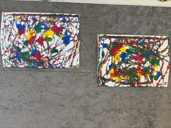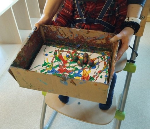 Gjennom året møter barna ulike formingsaktiviteter. Det er pennende å bli kjent med ulike teknikker og prøve maling på ulike måter. Her utforsker barna en ny metode. De maler ved å vippe på boksen slik at kulene beveger seg rundt.