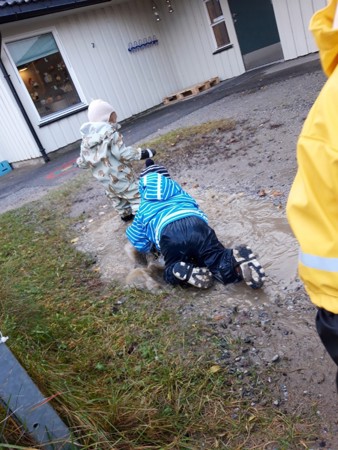Vi leker ute i all slags vær. Vann er kjempegøy!