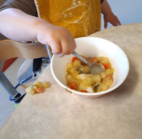 Vi har varrmat en gang i uka og legger vekt på at barna skal få mulighet til å spise selv.