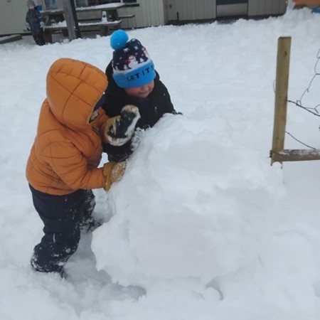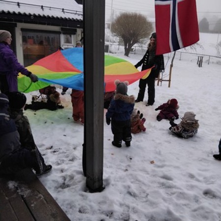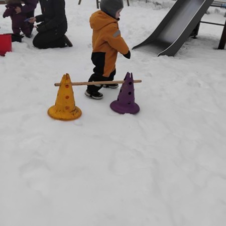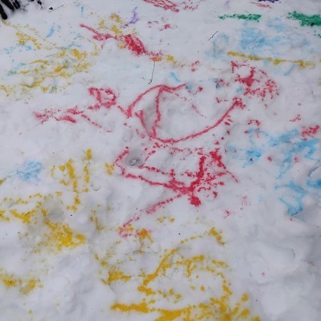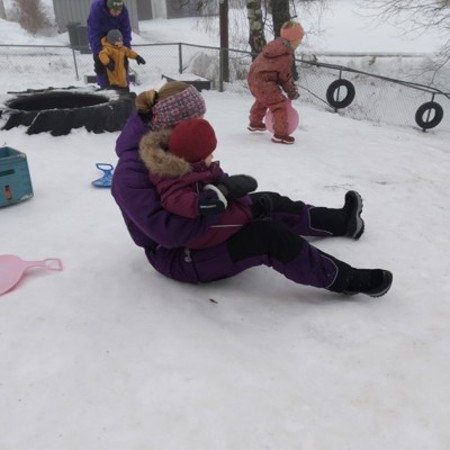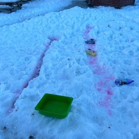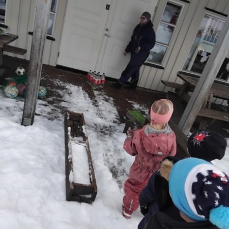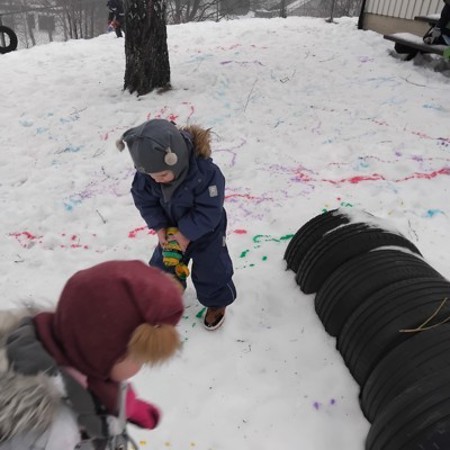 Her har vi spennende aktiviteter som maling på is/snø, flaskebob der vi ser hvem flaske som kommer lengst, såpebobler ute i snøen, lek i snøen og masse aking.