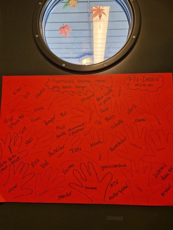 Her er det barna på Fantasia som har laget håndavtrykk av alle barna på avdelingen. Personalet har notert ned hva barna forteller at andre barn trenger for å ha det bra. Her er det mye god kunnskap