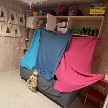 Vi liker å leke med tepper og bygge mange fine hytter.